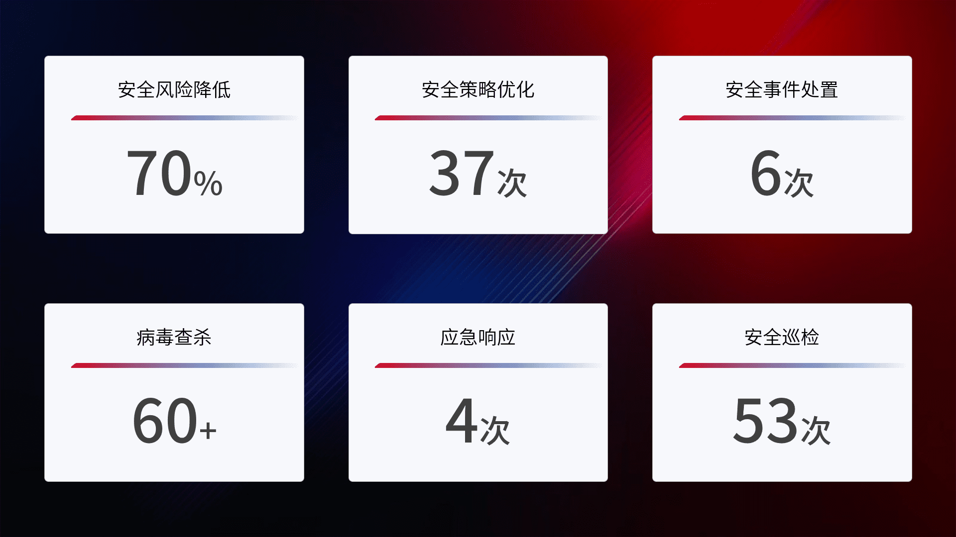 提供全面的安全事件报告体系,,包括处置报告、、、、周报、、、季度和年度总结,,,,结合持续监控,,帮助客户深入了解网络安全状况。。